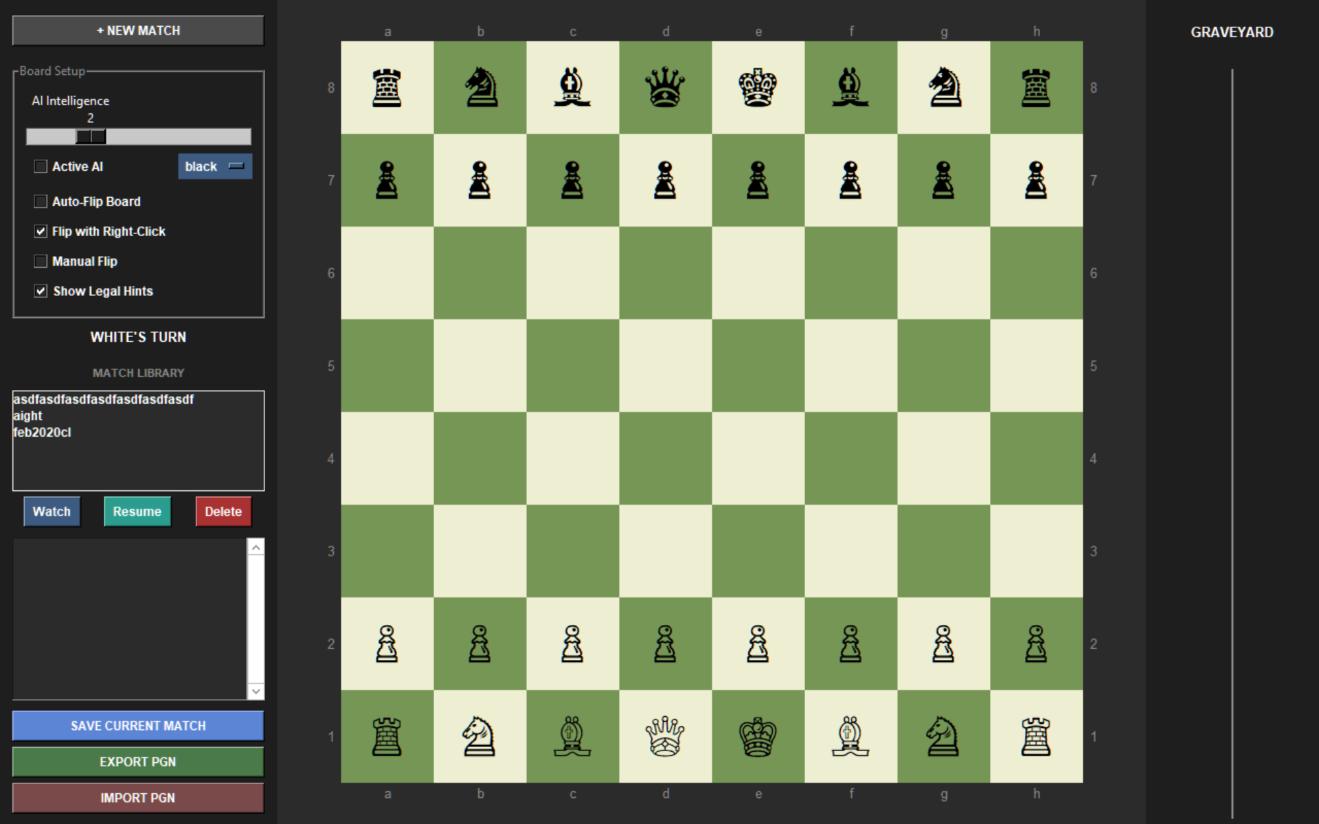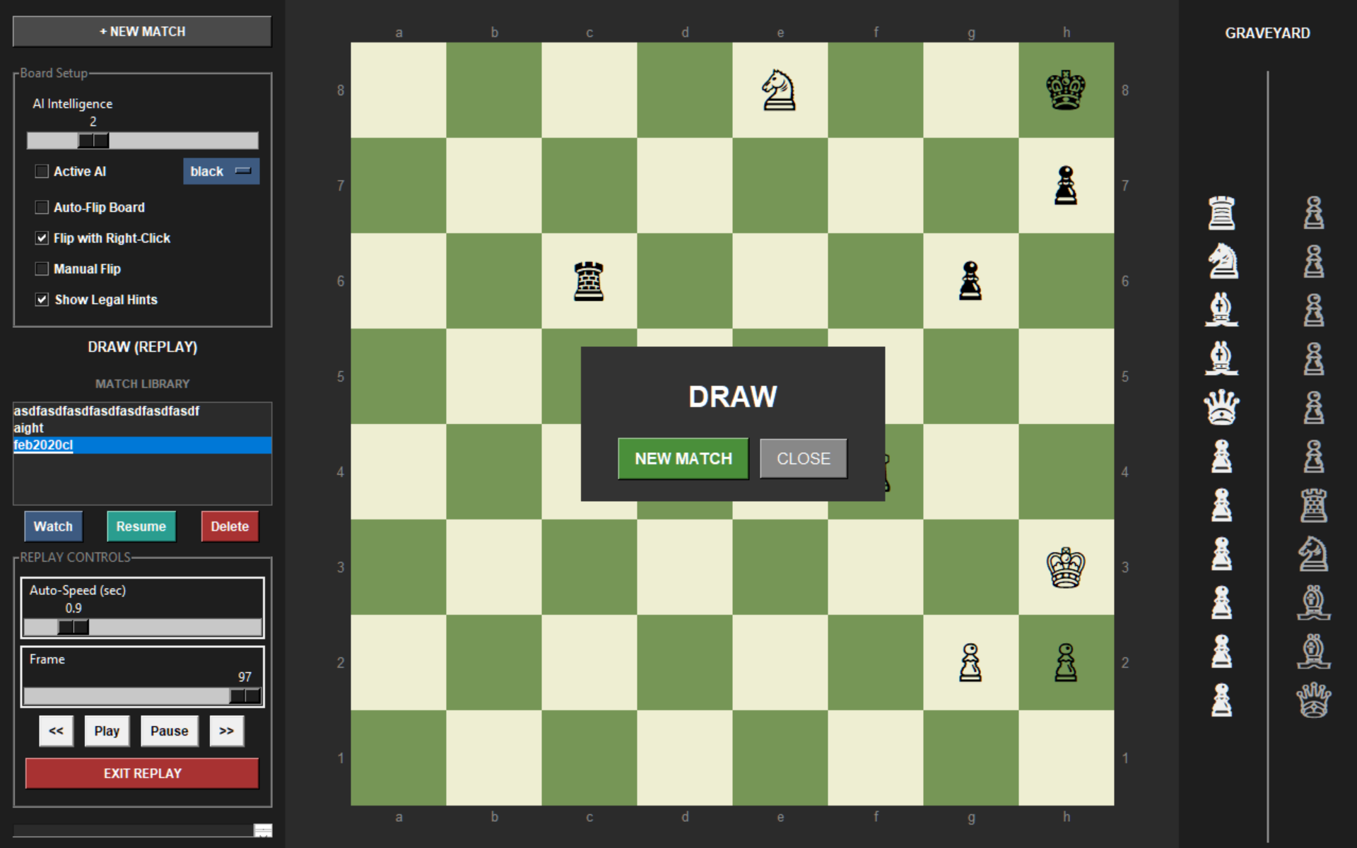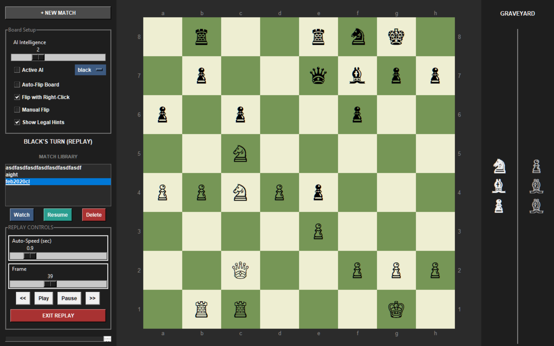 There is a "graveyard" for taken pieces and win screen that differentiates wins/draws